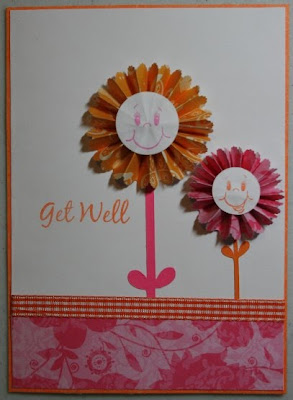 This is a 4 1/2"x6 1/4" card. I made it with white cardstock, then cut some orange mulberry cardstock the same size. I cut some more white cardstock 1/8" smaller and adhered it to the orange cardstock. The flowers are handmade, I used the tutorial from Splitcoast Stampers. I then cut white cardstock circles, one at 1" and one at 3/4." I then stamped them with some Peachy Keen faces, using tangerine and orchid pastel ink by ColorBox. The stems are cut from Walk in My Garden, the pink one at 2 3/4" and the orange one at 1 1/2." I adhered the stems to the card, then adhered the flowers. I cut a piece of patterned pink paper at 4 3/8"x1 1/2" for the bottom of the card, then wrapped a ribbon around it. I finished it off with my sentiment, which is stamped in tangerine ink by ColorBox.