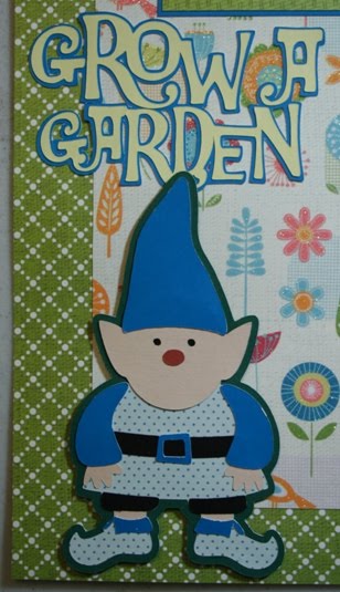 The layout it 12"x12." All the patterned cardstock and paper is from the DCWV Flower Shower Stack. I used the green patterned cardstock for the base of the layout. I then cut the flower cardstock at 10"x10" and adhered it in the middle of the green cardstock. I cut mats for three photos. The larger one is matted for a 4"x6" picture, with the green mat cut at 4 1/4"x6 1/4" and the blue mat cut 1/8" larger than that. The smaller ones are matted for 3"x3" photos. The green mats are cut at 3 1/4"x3 1/4" and the blue mats are 1/8" larger. The large sunflower is cut at 10" from the Bloom cartridge. I added some embossing to the center of the flower with the Swiss Dots folder. The mushrooms are from Cindy Loo. The larger one is cut at 2 1/2" and the smaller one was cut at 2." I used some glossy accents on the mushroom caps. The gnome is from Freshly Picked and cut at 5." The title, "Grow a Garden" is from Give a Hoot and cut at 2 1/4." I used the shadow feature on all my cuts to make them stand out. I adhered everything right to the scrapbook page, except the gnome and smaller mushroom...those are adhered with pop-dots for some dimension.