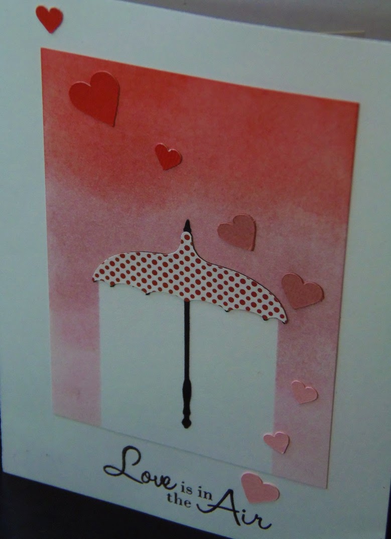 The umbrella is from the "Bridal Shower" Cricut cartridge. It is cut at 2 3/8" tall. It is just a hair wider than the piece of the card stock I masked off. The hearts are from the Cricut cartridge "The First Few Years." It is actually a border, but I hid the contour of everything but the hearts. I cut them at various sizes from colors of card stock that matched my inks. The sentiment is from Scrappy Moms Stamps, the Love Notes set.