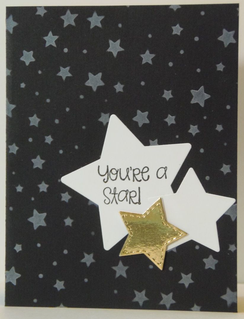 The card base is 5 1/2"x4 1/4" and made of black card stock.  I used a star stencil and white ink to create my background.  The stars are all dies from Jaded Blossom, the Star Dies set.  I used foam tape to pop up the gold star, which adds a nice pop to the black and white.  The sentiment is also from Jaded Blossom, the Superstar stamp set.